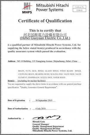 三菱日立電力系統合格供方證書
